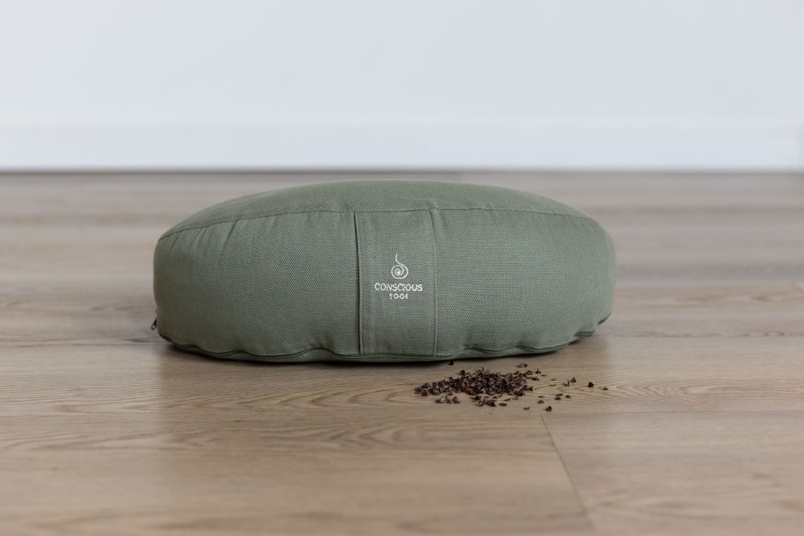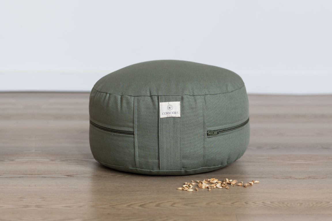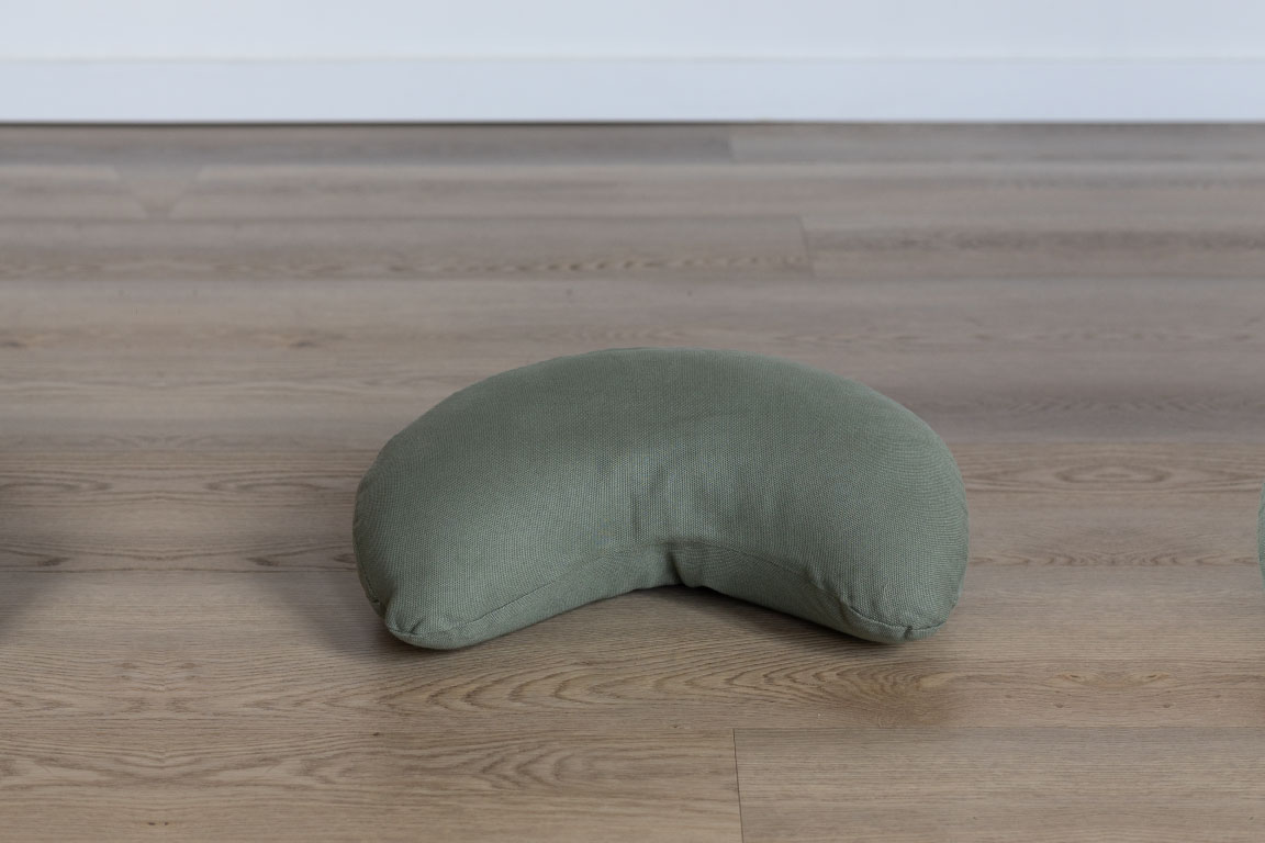 Ergonomic shape gently tilting the pelvis forward for a straight spine. Ideal for breathwork and cross-legged meditation, available in both a higher and a lower version to match different levels of flexibility. Filled with buckwheat, offers a firm support to the spine. Half moon shaped.